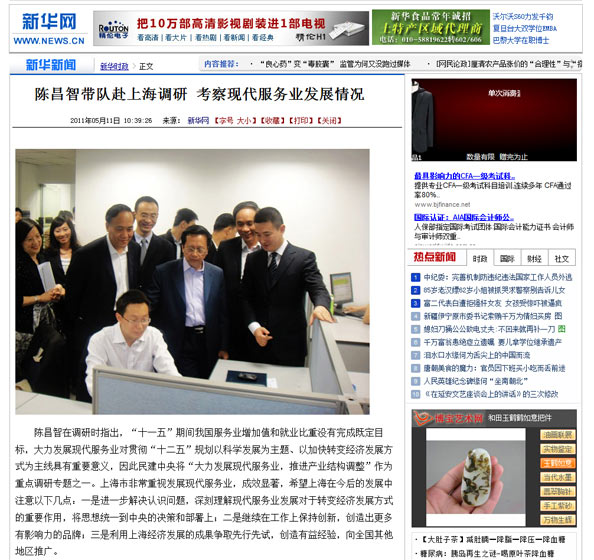 2011年5月10日的新華網(wǎng)以《陳昌智帶隊(duì)赴上海調(diào)研 考察現(xiàn)代服務(wù)業(yè)發(fā)展情況》為題,報(bào)道了全國(guó)人大常委會(huì)副委員長(zhǎng)、民建中央主席陳昌智到易貿(mào)集團(tuán)實(shí)地考察,并定高度肯定了易貿(mào)在十二年間取得的成績(jī)。