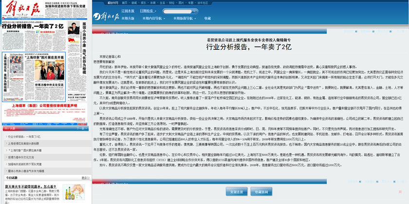 2010年1月4日的《解放日?qǐng)?bào)》在頭版頭條以《行業(yè)分析報(bào)告,一年賣了2億—易貿(mào)資訊公司趕上現(xiàn)代服務(wù)業(yè)快車舍得投入做精做?!窞轭},報(bào)道了易貿(mào)在過去十年在大宗商品的資訊及會(huì)展服務(wù)領(lǐng)域取得的豐碩成果。