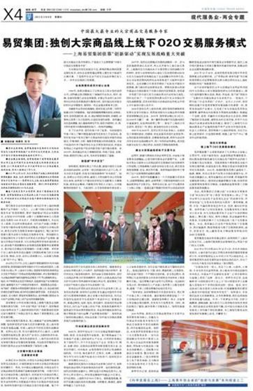 2012年3月15日,《中國(guó)貿(mào)易報(bào)》在今年全國(guó)“兩會(huì)”召開前夕,對(duì)易貿(mào)集團(tuán)CEO張曄進(jìn)行了獨(dú)家專訪,并在X4版以《易貿(mào)集團(tuán):獨(dú)創(chuàng)大宗商品線上線下O2O交易服務(wù)模式》為題,整版報(bào)道了作為上?,F(xiàn)代服務(wù)業(yè)創(chuàng)新發(fā)展的典型,易貿(mào)集團(tuán)12年的發(fā)展歷程。