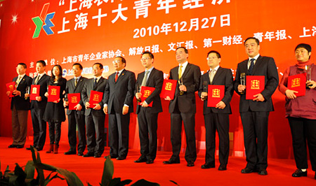 “上海農(nóng)商銀行杯”2009-2010年度上海十大青年經(jīng)濟人物評選結(jié)果于12月27日揭曉,易貿(mào)集團總裁張曄先生獲此殊榮。上海市委常委、統(tǒng)戰(zhàn)部長楊曉渡,團市委書記潘敏,市國資委黨委副書記呂永杰,團市委副書記徐彬等出席了表彰會。