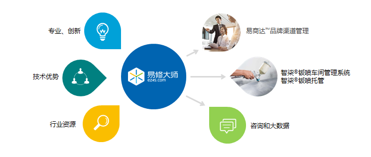 秉承集團公司專業(yè)、創(chuàng)新的服務(wù)理念,憑借優(yōu)越的技術(shù)背景和行業(yè)資源,2014年開始,我們用心構(gòu)建易修大師平臺,為汽車后市場鈑噴行業(yè)客戶提供三大核心服務(wù)內(nèi)容: